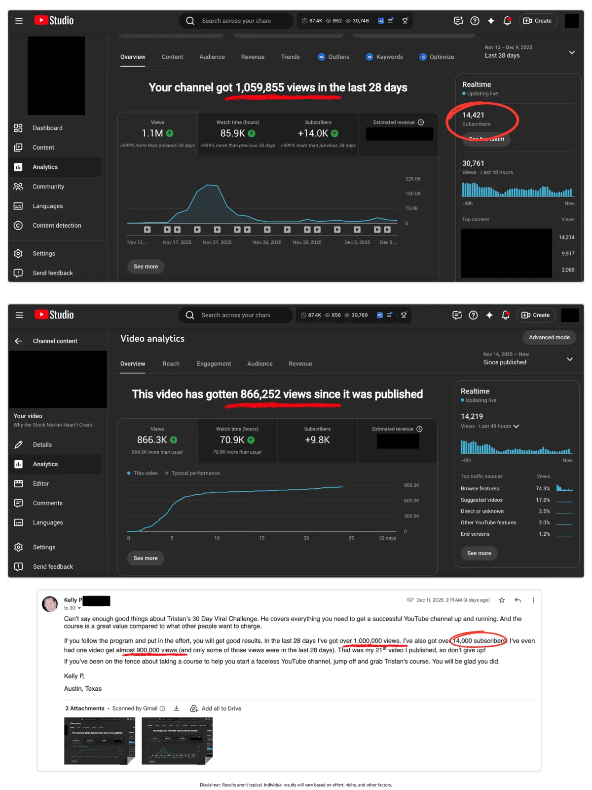 Below are screenshots from Kelly's YouTube dashboard, his viral video stats as well as the email he sent me: